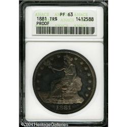 1881 T$1 PR63 ANACS. Only 960 pieces were made of <B>1881 T$1 PR63 ANACS.</B></I> Only 960 pieces were made of this proof-only issue. The fields still retain their reflective proof characteristics despite the layer of lavender, mauve, and cobalt-blue toning. A very handsome piece, with boldly struck design elements, that will fit comfortably into a high-grade Trade collar collection. <BR><BR><B>Important notice:</B> Heritage usually auctions material at the rate of 200-250 lots per hour. On some occasions eBay Live bid software or the Internet may not be able to keep up with the pace of the auction. We recommend placing a realistic absentee bid now as insurance to avoid disappointment. Occasionally the auctioneer may eliminate or reject an eBay Live bid, and the auctioneer may also reopen a lot after the close of the eBay live bidding (usually because we missed an audience bid), and may reject your bid even if it shows you as the winning bidder. By bidding via eBay Live, you agree that Heritage may award the lot to another bidder at its sole discretion under the circumstances described above or any other reasonable circumstances. Since eBay bids are not shown to us until we open the lot on the floor, we treat those bids just like floor bids. In most cases the floor responds before the eBay bid is presented to us, due to Internet lag time, so for consistency we have made it a policy that floor bids are always considered first over tie eBay live bids. Also please note that all Heritage lots purchased through eBay Live carry a 20% Buyer's Premium. Please make sure you read the Terms and Conditions before you bid. This lot is being auctioned in conjunction with a live floor auction by Heritage Galleries & Auctioneers. All final auction and invoice information will be supplied by Heritage Galleries & Auctioneers, and all other information should be considered preliminary. Lot:6416