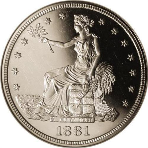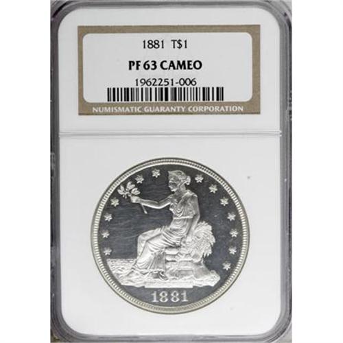 <B>1881 T$1 PR63 Cameo NGC.</B></I> The contrast approaches an Ultra Cameo designation, since the penetratingly struck devices are thickly frosted. The reverse is nearly pristine, and the obverse is also undisturbed aside from a few faint hairlines near Liberty's extended arm. The 1881 has the lowest mintage of the proof-only dates between 1879 and 1883. Only 960 pieces were struck. Census: 17 in 63 Cameo, 56 finer (6/07).<BR><BR><b>Shipping:</b> Coins & Currency (<a target="_blank" href="http://www.heritageauctions.com/common/shipping.php">view shipping information</a>\)