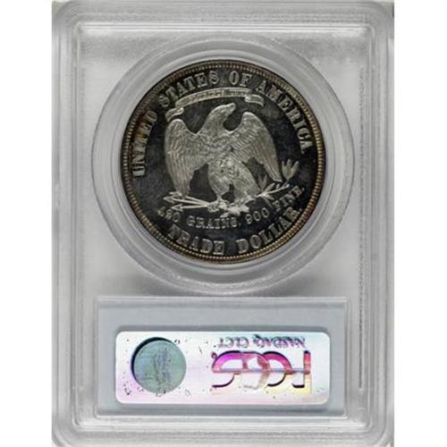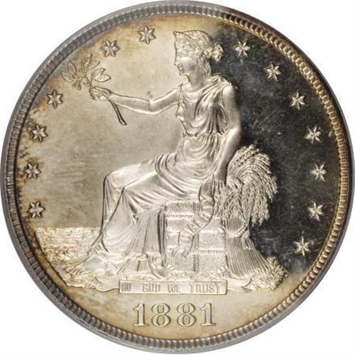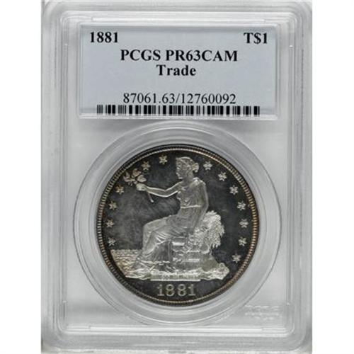 <B>1881 T$1 PR63 Cameo PCGS.</B></I> Unlike many (most?) examples of the 1881 Trade dollar, this piece is fully detailed in all areas. All the star radials are completely defined, the head of Liberty is intricately struck, and the eagle's plumage is fully articulated. Much brilliance remains on both sides, but there is a noticeable accent of golden toning around the margins. Lightly hairlined. Population: 12 in 63 Cameo, 50 finer (2/08).<BR><I>From The Queller Family Collection of Silver Dollars.</B></I><BR><BR><b>Shipping:</b> Coins & Currency (<a target="_blank" href="http://www.heritageauctions.com/common/shipping.php">view shipping information</a>)