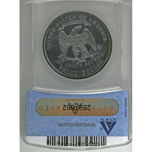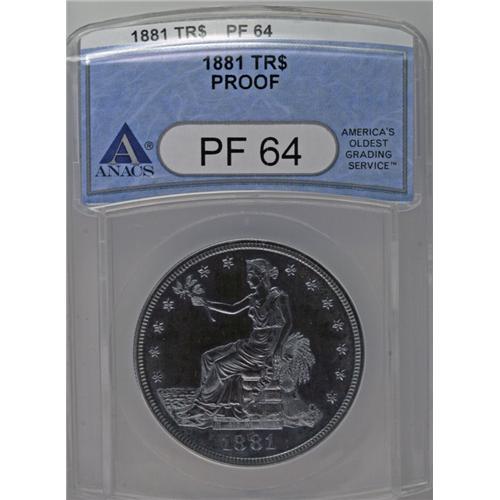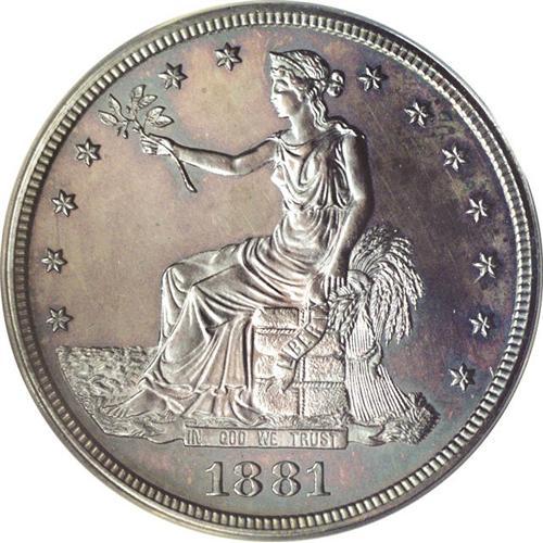 <B>1881<T$1> PR64 ANACS.</B></I> Forest-green and rose-red blushes envelop this pinpoint-sharp near-Gem. The devices appear frosted, and this piece would likely attain a Cameo designation if it were not richly toned. The 1881 is the lowest mintage of the 1879 to 1883 proof-only dates.<BR><I>From The Antigo Collection, Part Two.</B></I>