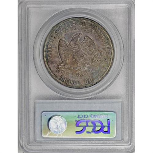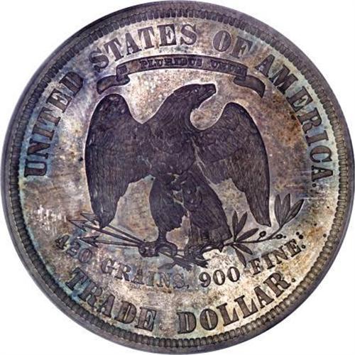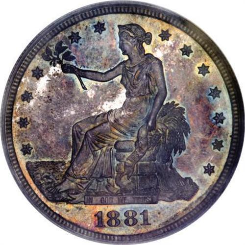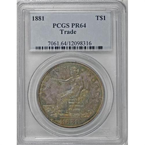 <B>1881 T$1 PR64 PCGS.</B></I> The 1881 Trade dollar is a proof-only issue of 960 pieces. This near-Gem illustrates reflective fields that establish a noticeable contrast with the sharply impressed design features when the coin is tilted slightly under a light source. Dusky golden-gray, cobalt-blue, and lilac toning cover minimally abraded surfaces.<BR><BR><B>Coin Engraver:</B> William Barber<BR><BR><b>Shipping:</b> Coins & Currency (<a target="_blank" href="http://www.heritageauctions.com/common/shipping.php">view shipping information</a>)