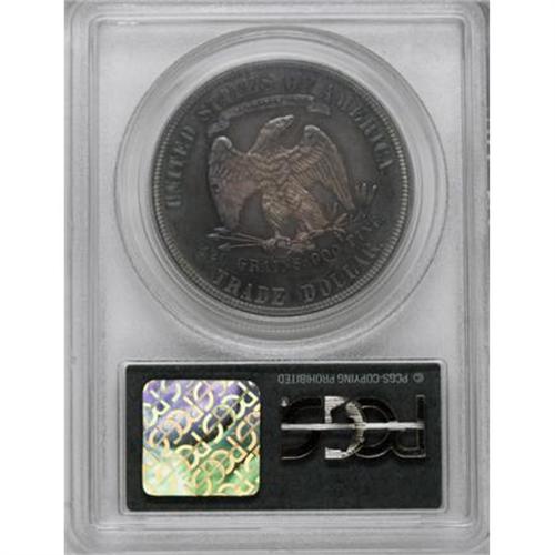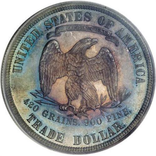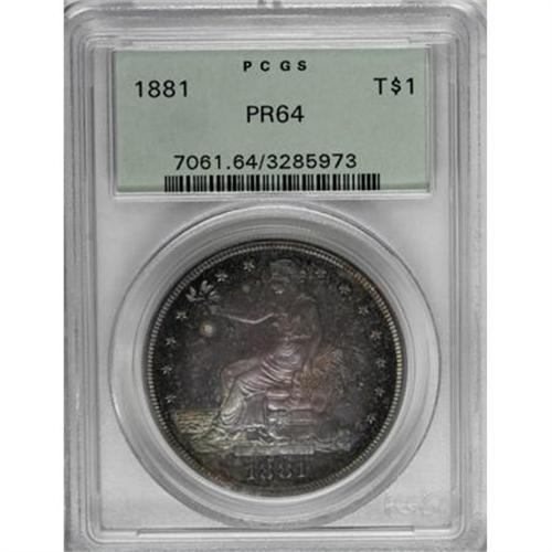 <B>1881 T$1 PR64 PCGS.</B></I> Forest-green, apricot, and plum-mauve embrace this razor-sharp near-Gem. A few nearly imperceptible hairlines are concealed beneath the rich original toning. 420 GRAINS is lightly die doubled, as usual for this proof-only date. Housed in a green label holder.<BR><BR><B>Coin Engraver:</B> William Barber<BR><BR><b>Shipping:</b> Coins & Currency (<a target="_blank" href="http://www.heritageauctions.com/common/shipping.php">view shipping information</a>)