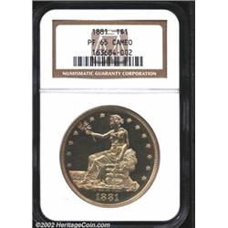 1881 T$1 PR65 Cameo NGC. Curiously for a proof-only issue with just 960 pieces produced, the 1881 is a mostly poorly produced date. Many otherwise attractive survivors are limited in grade and/or eye appeal by isolated areas of striking incompleteness. This feature is typically confined to the obverse over Liberty's head and some of the star centrils. That said, we call bidder attention to the present Gem. There is not a single ill-defined feature on either side, and the smooth surfaces are layered in warm golden-honey iridescence. Beautifully contrasted, and expertly preserved.From the Andy Geosits Collection of Trade Dollars. Important notice: We expect to be auctioning lots at the rate of 200-250 per hour. Sometimes eBay Premier live bid software cannot keep up with that pace, so we strongly recommend that you place a realistic proxy bid now as insurance to avoid disappointment. Also please note that all Heritage/CAA lots purchased through eBay Premier carry a 20% Buyer's Premium. Please make sure you read the Terms and Conditions.