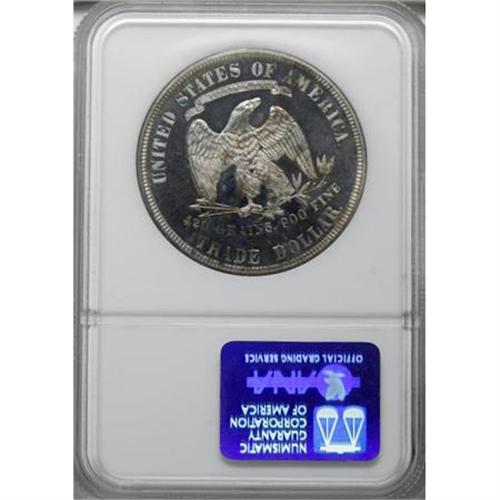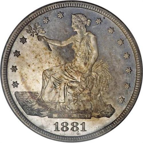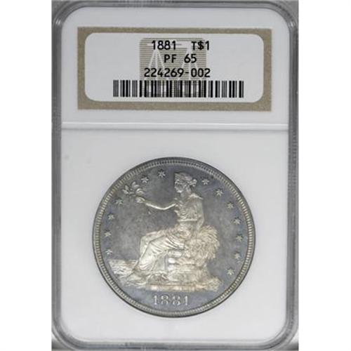 <B>1881 T$1 PR65 NGC.</B></I> Boldly detailed and lightly toned, this Gem proof trade dollar is an exceptional piece for the date or type collector. Both sides have deep mirrors beneath wispy golden-brown toning, with lustrous devices that provide excellent cameo contrast. Like every Philadelphia Trade dollar from 1878 to 1883, this is a proof only date that is ideal not only for the date collector, but for the type collector as well.<BR><I>From The Fleur Wales-Baillie Collection.</B></I><BR><BR><B>Coin Engraver:</B> William Barber<BR><BR><b>Shipping:</b> Coins & Currency (<a target="_blank" href="http://www.heritageauctions.com/common/shipping.php">view shipping information</a>)
