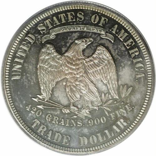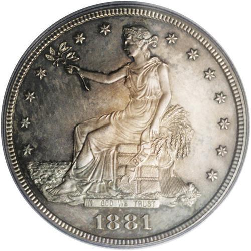 <B>1881<T$1> PR65 PCGS.</B></I> Rather deeply toned in mauve and bluish-green shades, having a muting effect on the obverse of the coin. This is the second scarcest issue (behind the 1878) of the collectible, proof-only Trade dollars with a mintage of 960 pieces. Population: 33 in 65, 12 finer (4/06).