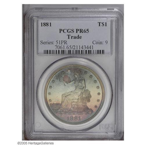 1881 T$1 PR65 PCGS. While sometimes unevenly struck, t 1881[T$1] PR65 PCGS.