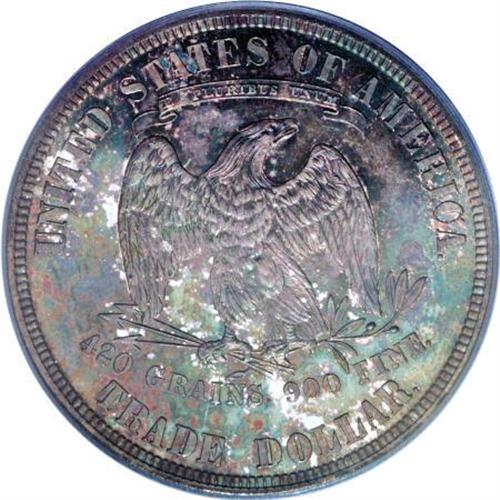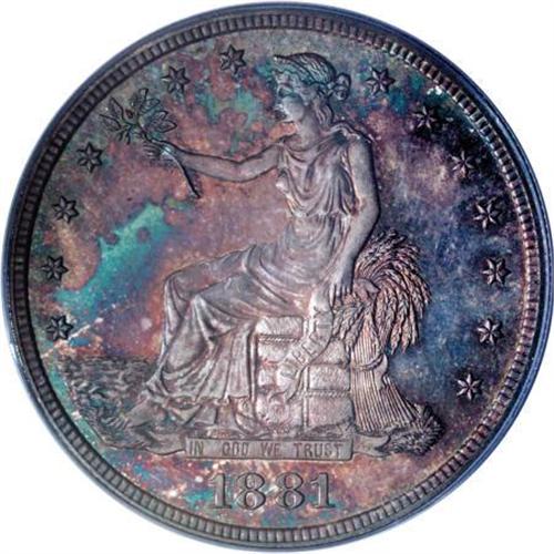 <B>1881 T$1 PR65 PCGS.</B></I> Ex: Hesselgesser. The proof-only 1881 is always a collector favorite, with its low mintage of 960 specimens. The piece offered here is a particularly impressive coin with deeply mirrored fields on each side. The reflectivity flashes strongly through irregular swirls of deep blue, copper-brown, and sea-green toning. Highly elusive any finer. Population: 35 in 65, 12 finer (7/07).<BR><BR><B>Coin Engraver:</B> William Barber<BR><BR><b>Shipping:</b> Coins & Currency (<a target="_blank" href="http://www.heritageauctions.com/common/shipping.php">view shipping information</a>\)