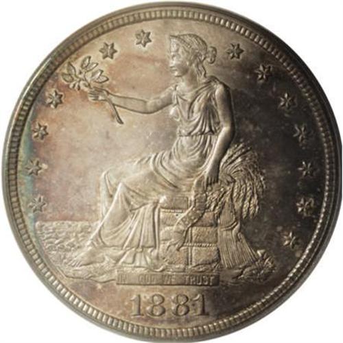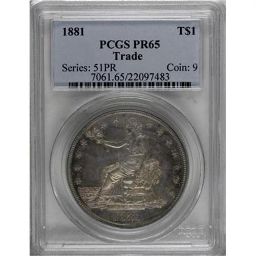 <B>1881 T$1 PR65 PCGS.</B></I> Pale heather and iridescent toning grace both sides of this delightful Gem proof. Mintages of the proof-only trade dollars from 1881 to 1883 were each slightly lower than the similarly dated Morgan dollars in proof. Pieces were sold individually, as well as part of complete proof sets, although some collectors preferred proof sets that only included the Morgan dollar.<I><BR>From The Beau Clerc Collection.</B></I><BR><BR><B>Coin Engraver:</B> William Barber<BR><BR><b>Shipping:</b> Coins & Currency (<a target="_blank" href="http://www.heritageauctions.com/common/shipping.php">view shipping information</a>)