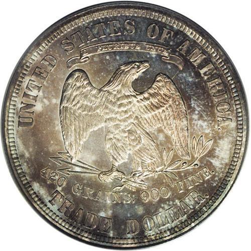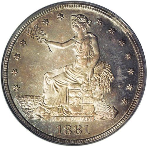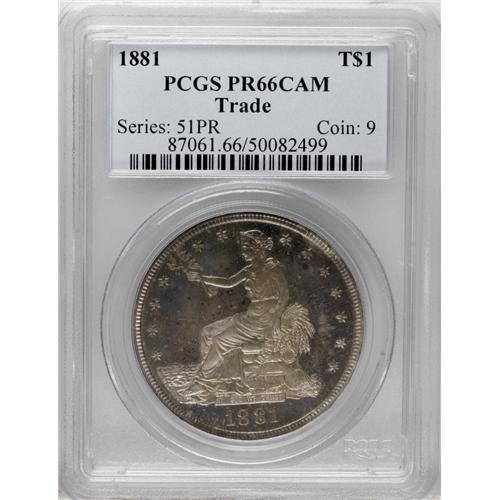 <B>1881 T$1 PR66 Cameo PCGS.</B></I> Only 960 coins were struck of the 1881 Trade dollar, all of which were proofs. There was considerable striking variability among those few coins with many pieces displaying weakness on Liberty's head and the upper stars. This is a well produced striking that shows complete definition in all areas. The mirrored surfaces flash brightly through the moderate golden-rose toning that covers most of each side, and the devices are set against the deeply reflective fields. Nearly free from post-striking impairments, this lovely coin is suggestive of an even higher grade. Population: 7 in 66, 2 finer (10/06).<BR><BR><b>Shipping:</b> Coin/Currency (<a target="_blank" href="http://www.heritageauctions.com/common/shipping.php">view shipping information</a>)
