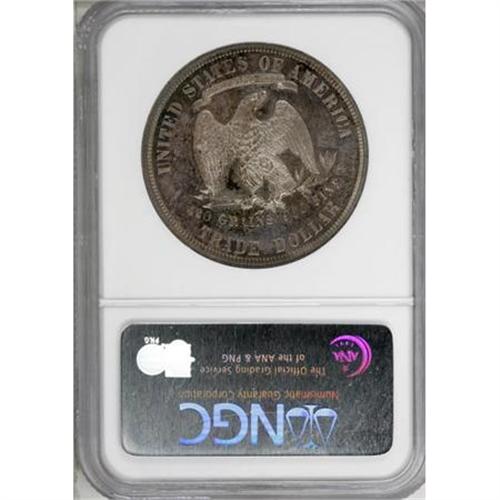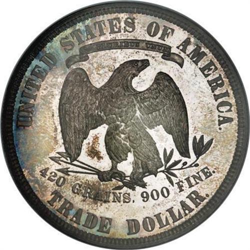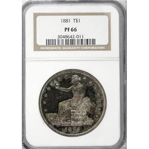 <B>1881 T$1 PR66 NGC.</B></I> This is an impressive, sharply struck specimen with unusual and interesting color. The basic effect is that of antique silver; however, most of the obverse fields and areas near the left reverse lettering are covered in an iridescent melange of blue, violet, sea-green, deep yellow, and burgundy, all of which are simultaneously visible when turned under a light just so. A bit of reflectivity remains, as well. A mark behind Liberty's head appears to define the grade.<BR><BR><B>Coin Engraver:</B> William Barber<BR><BR><b>Shipping:</b> Coins & Currency (<a target="_blank" href="http://www.heritageauctions.com/common/shipping.php">view shipping information</a>)