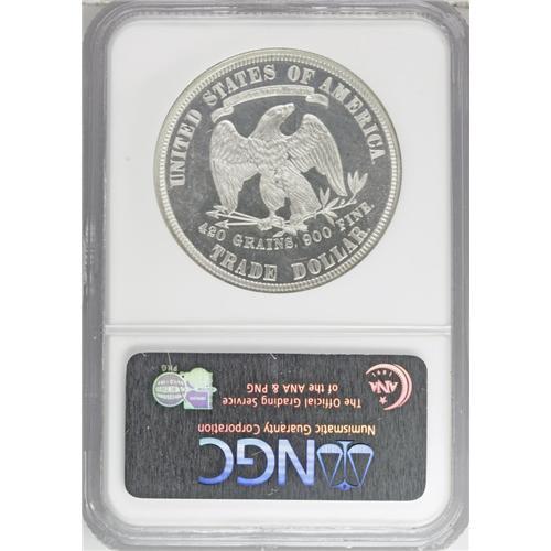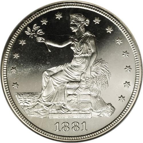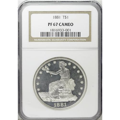 <B>1881 T$1 PR67 Cameo NGC.</B></I> A total of 960 coins were struck of the 1881 proof-only Trade dollar. In David Bowers' discussion of this issue in his <I>Silver Dollars and Trade Dollars of the United States,</B></I> he speculates on its sales distribution: "...I estimate that about half of these went to individual numismatists, some of who ordered a duplicate or two; most of the remaining half went to dealers such as J.W. Scott (in particular), Ebenezer Mason, Jr., and others who had a wide trade. Inevitably, a few went to non-collectors who were casually interested in coins, some of whom ordered coins for anniversaries, holidays, or special events; such orders probably amounted to fewer that 50 coins." Bowers further comments on the "poor workmanship' of these coins: "Most of the proofs of this year were poorly struck and exhibit flatness in areas, particularly on the head of Miss Liberty and on the upper stars. This was due to incorrect die setting in the press. Poor striking continued to be a problem into 1883."<BR> A fair number of this issue have survived, as indicated by the approximately 600 pieces that have been certified by NGC and PCGS combined. Only about 140 or so examples have been assigned the Cameo designation, most of which are in Premium Gem and below. Only 10 PR67 Cameo specimens have been seen, and a mere three finer (10/06).<BR> The Superb Gem in this lot certainly exceeds the quality of the typical 1881 proof example. The strike is impressive throughout the design elements, including excellent detail on Liberty's head and on the upper stars, areas that are usually flat. Essentially untoned surfaces are impeccably preserved; a tiny mark on Liberty's left (right facing) elbow will help to pedigree the coin. This piece displays outstanding quality in all respects.<BR><BR><b>Shipping:</b> Coin/Currency (<a target="_blank" href="http://www.heritageauctions.com/common/shipping.php">view shipping information</a>)