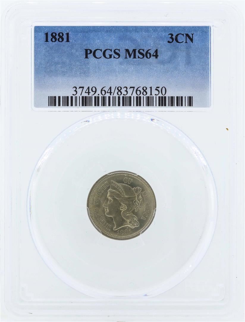 One 1881 Three Cent Nickel Piece Coin PCGS MS64. PCGS Graded.