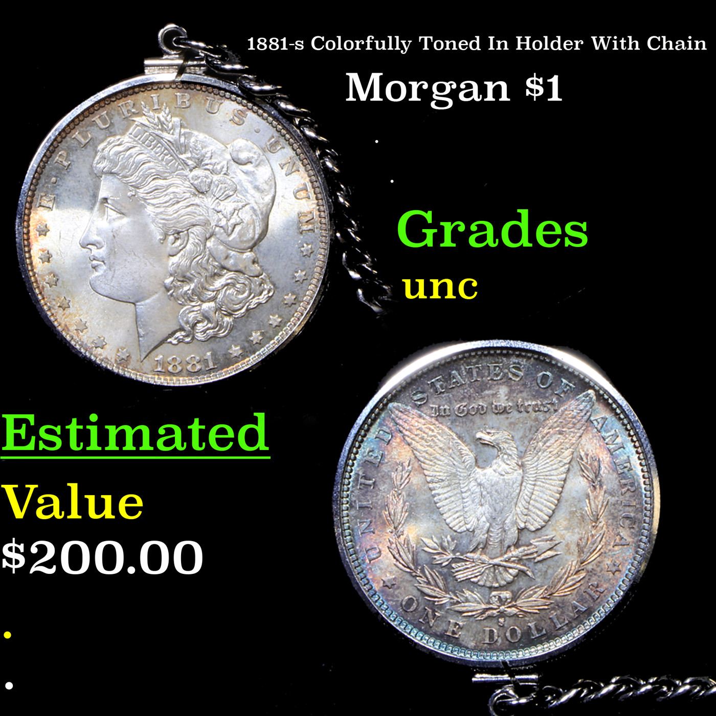 1881-s Colorfully Toned In Holder With Chain Morgan Dollar $1 Grades Brilliant Uncirculated.