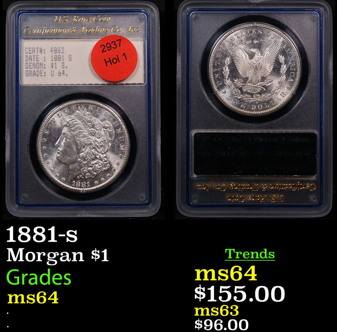 1881-s Morgan Dollar $1 Graded ms64 By US Rare Coin.