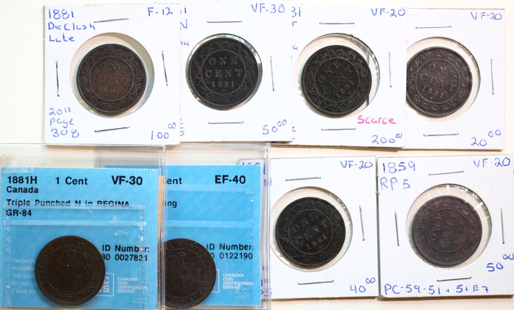 1881H 1¢, Group of 8 pieces with better varieties. Includes scarce and seldom seen pieces. All identified. Grades vary from abt.VG to EF.