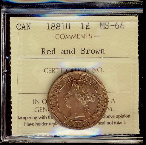 1881H 1¢ ICCS MS64 Red and golden brown. 70% red lustre. Very nice.
