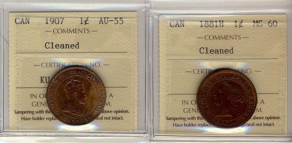 1881H 1¢ MS60 & 1907 1¢ AU55. Lot of 2 coins both ICCS graded and designated as cleaned.