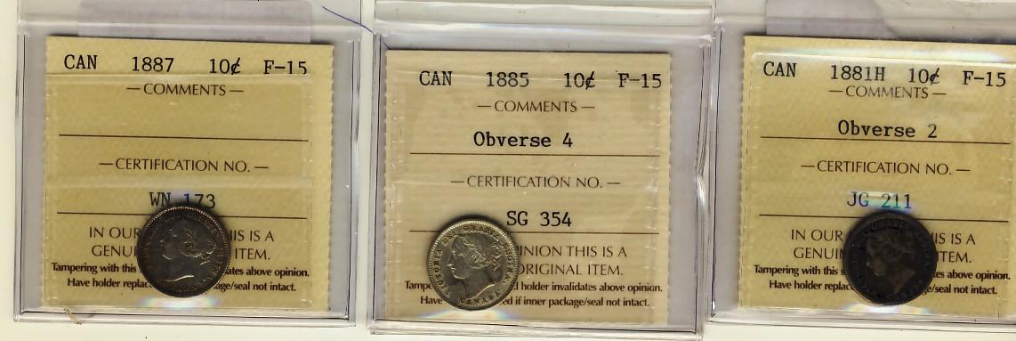 1881H 10¢ Obv 2, 1885 Obv 4 & 1887 ICCS F15. Lot of 3 coins.