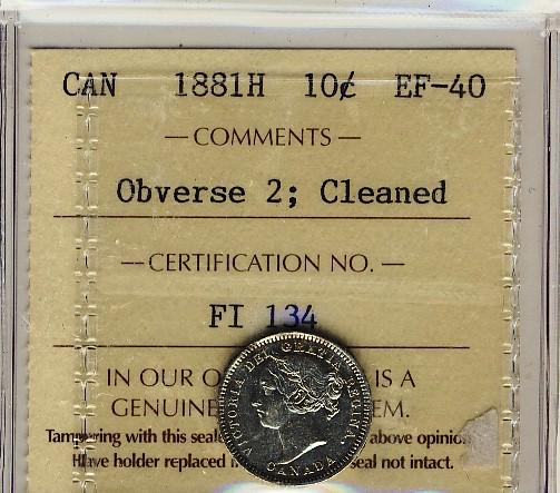 1881H 10¢ Obv 2 ICCS EF40 Cleaned