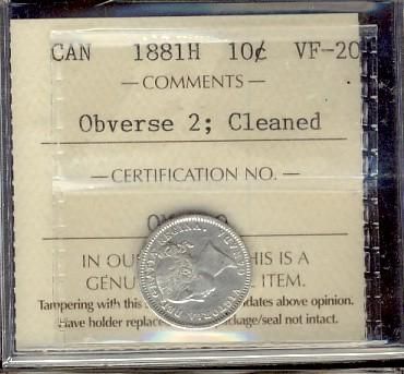 1881H 10¢ Obv 2 ICCS VF20 Cleaned.