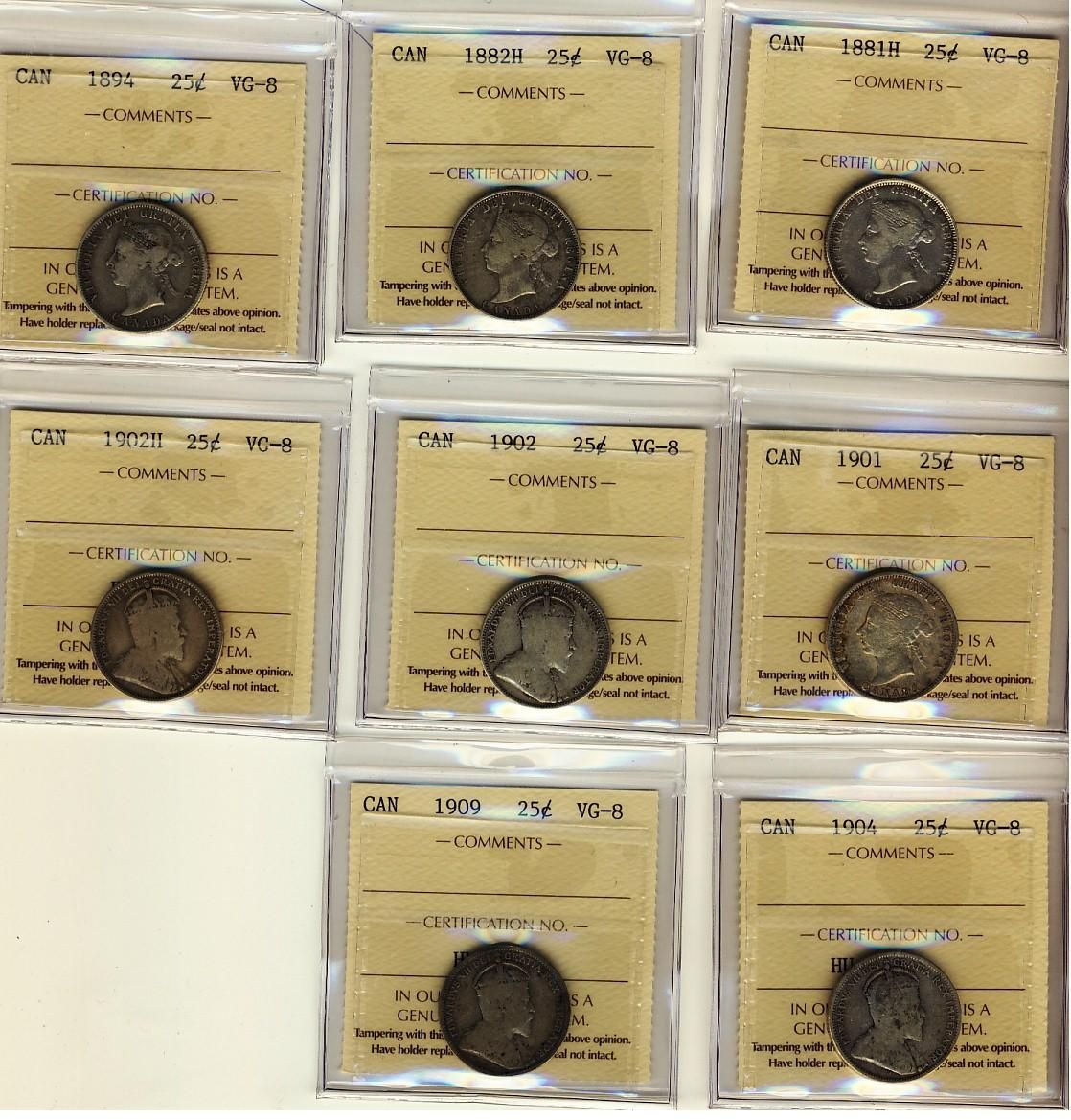 1881H, 1882H, 1894, 1901, 1902, 1902H, 1904 & 1909 25¢ ICCS VG8. Lot of 8 coins.