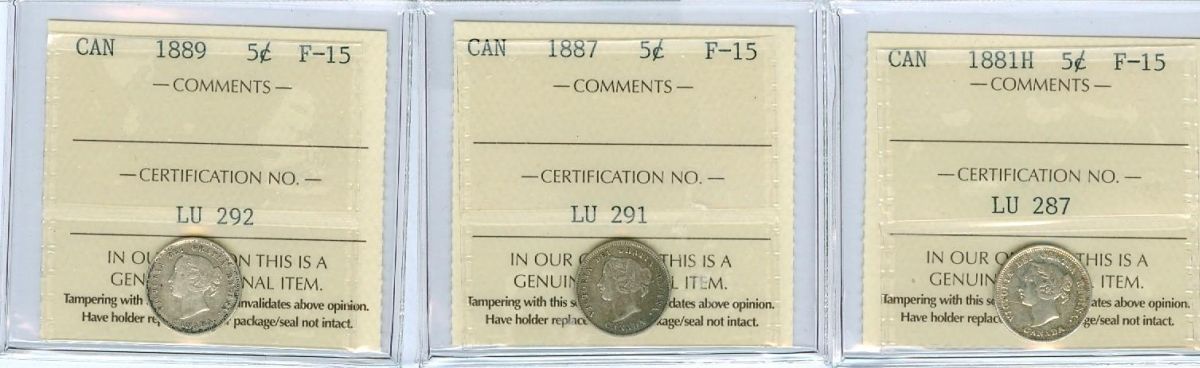 1881H, 1887 and 1889 5¢. Lot of 3 ICCS graded coins, all F15.