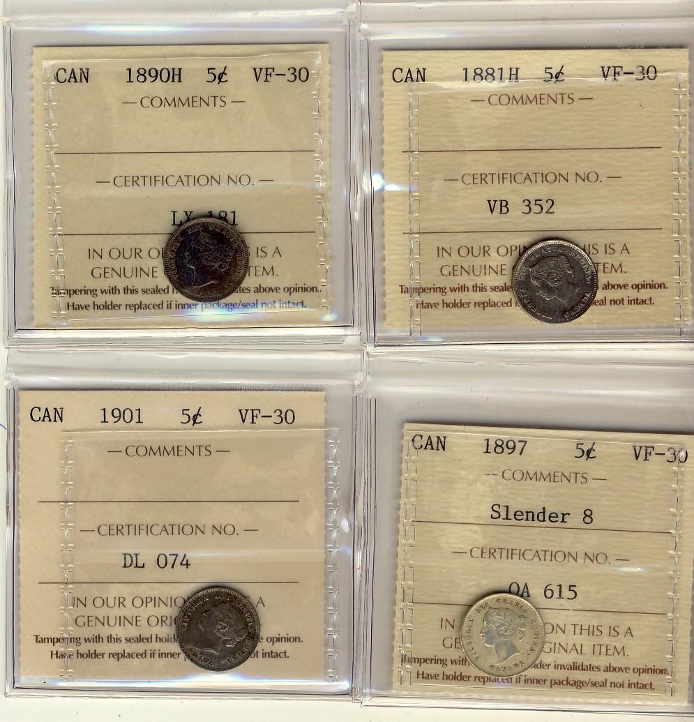 1881H, 1890H, 1897 Slender 8 & 1901 5¢ ICCS VF30. Lot of 4 coins all problem free.