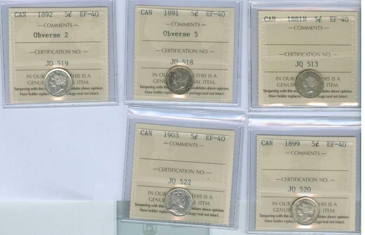 1881H - 1903 5¢ ICCS EF40. Lof of five coins including, 1881H, 1891 Obv 5, 1892 Obv 2, 1899 and 1903,