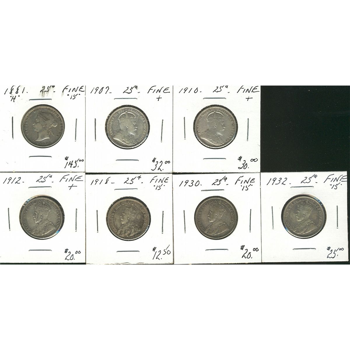1881H 25¢,1907, 1910, 1912, 1918, 1930 & 1932. Lot of 7 coins all Fine+. (PBA).