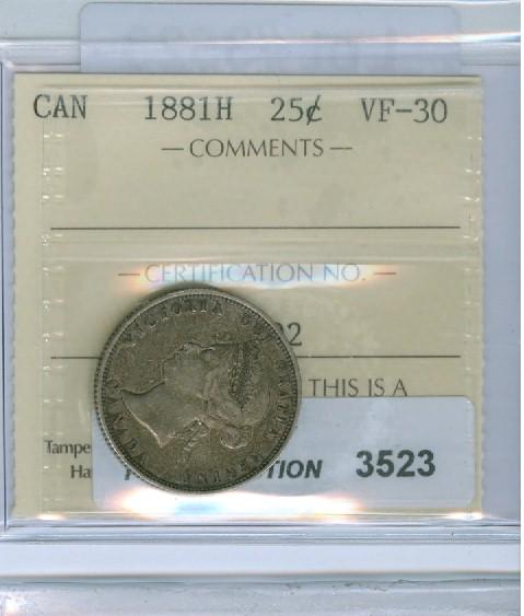 1881H 25¢ ICCS VF-30. Medium to heavy toning.