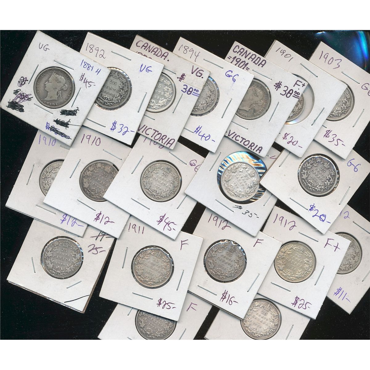 1881H 25¢ to 2010 Lot; includes diverse set of dates with key issues 1894, 1927 & 1936 dot included. No 1875H, 1884 or 1889. Victorian pcs includes 1881H, 1892(2), 1894 & 1901(2), Edw 1903(2), 1905, 1908, 1910(3) and Geo V plus. A nice dealer stock with 186 pcs (76 Silv), Good to UNC.
