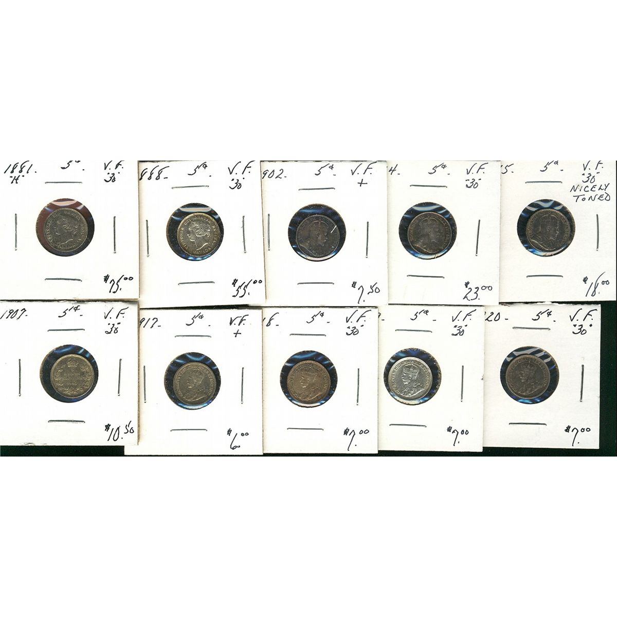1881H 5¢, 1888, 1902, 1904, 1905, 1907, 1917, 1918, 1919 & 1920. Lot of 10 coins all VF30. (PBA).