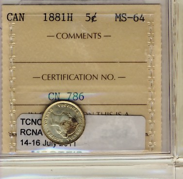 1881H 5¢ ICCS MS64. Strong lustre.