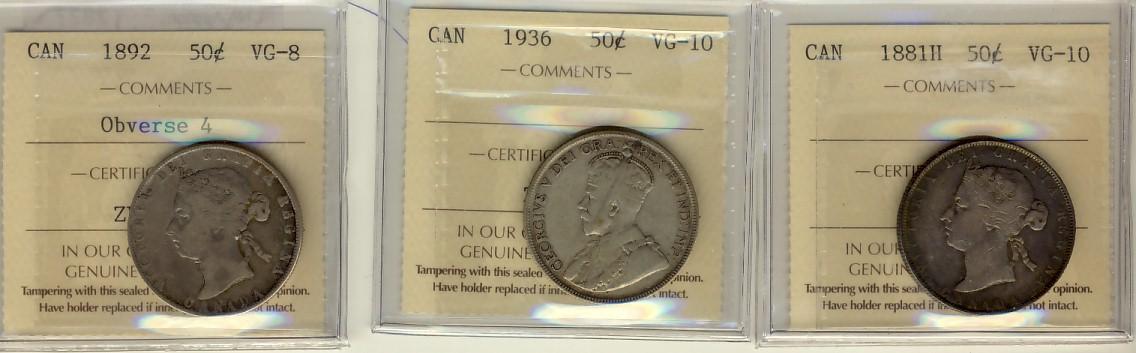 1881H 50¢, 1892 Obv 4 & 1936 ICCS VG10 & 1936 F15. Lot of 4 coins. 1892 VG8.
