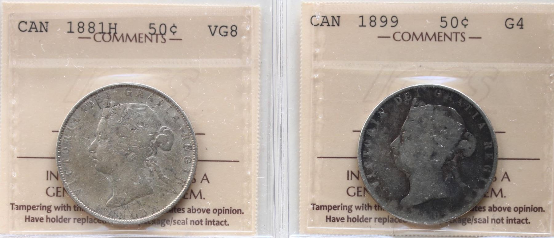 1881H 50¢ ICCS Very Good-8, 1899 ICCS Good-4. Lot of 2 coins.