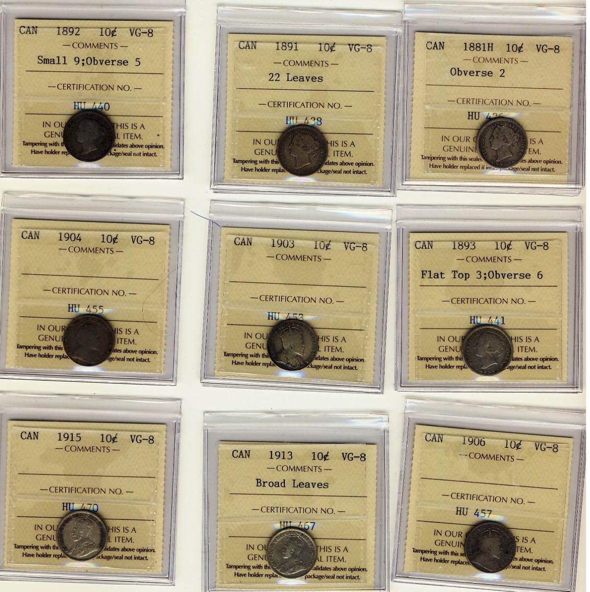1881H Obv 2, 1891 22 Lvs, 1892 Sml 9 Obv 5, 1893 FT Obv 6, 1903, 1904, 1906, 1913 BL & 1915 10¢ ICCS