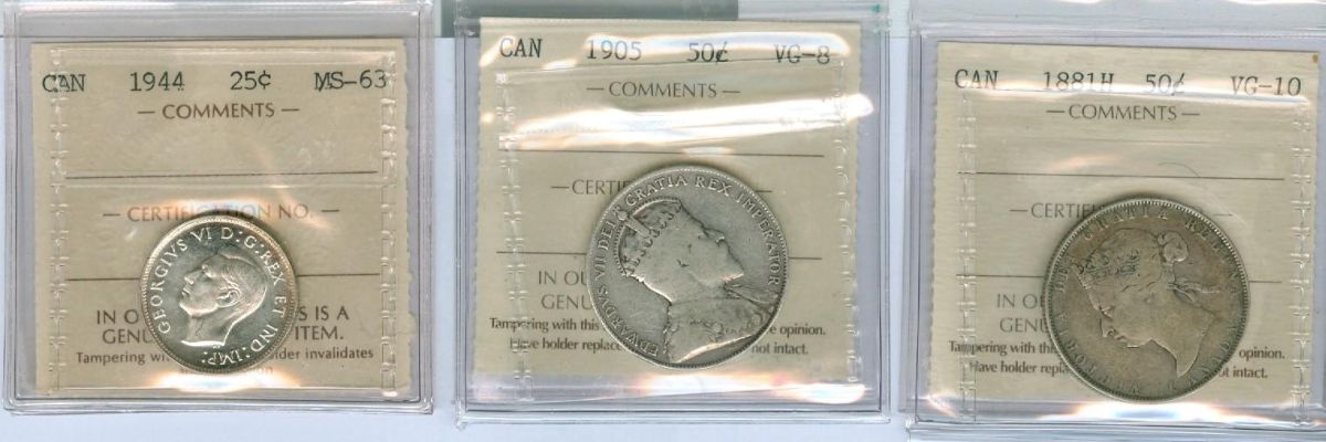 1881H VG10 & 1905 VG 8 50¢. Lot of 3 coins all ICCS graded, also includes 1944 25¢ MS63.