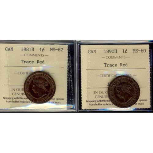 1881H and 1890H 1¢ both ICCS trace red, 1881H grades MS62 and MS60 for the 1890H.