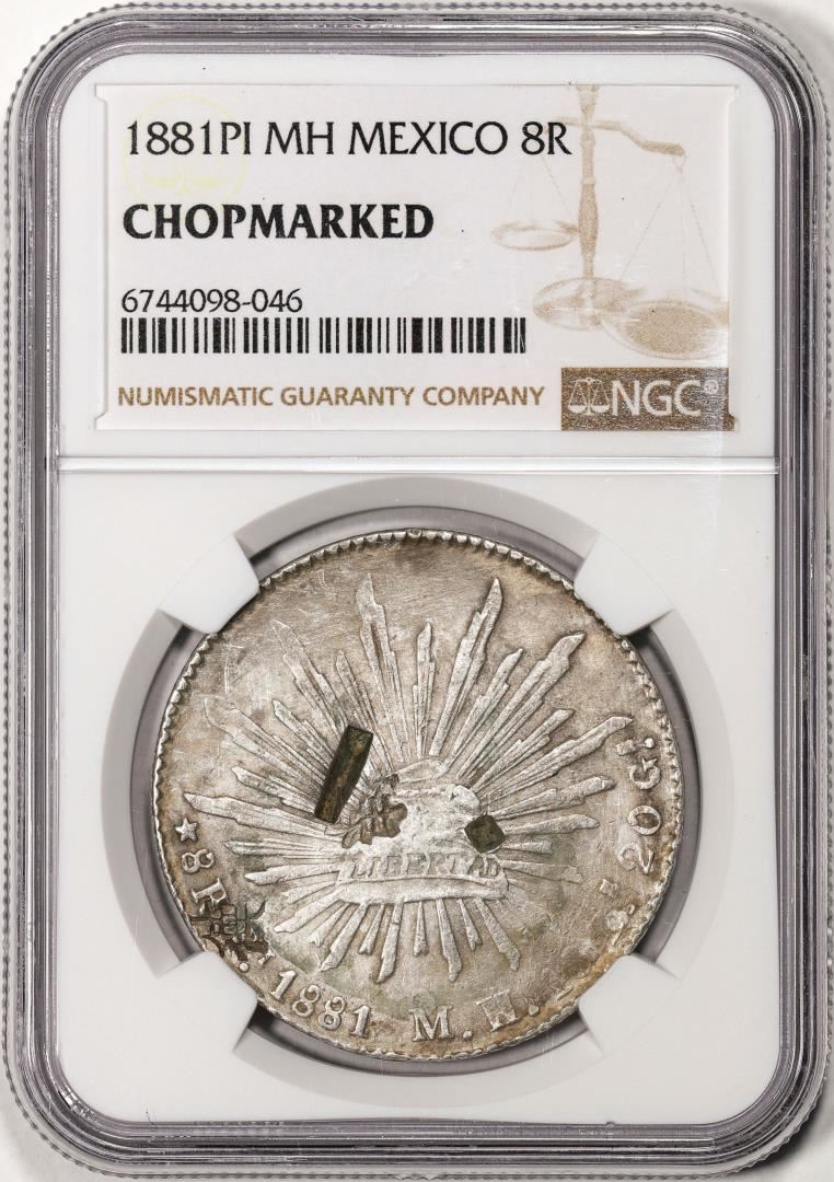 One 1881PI MH Mexico 8 Reales Silver Coin NGC Chopmarked. NGC Certified.