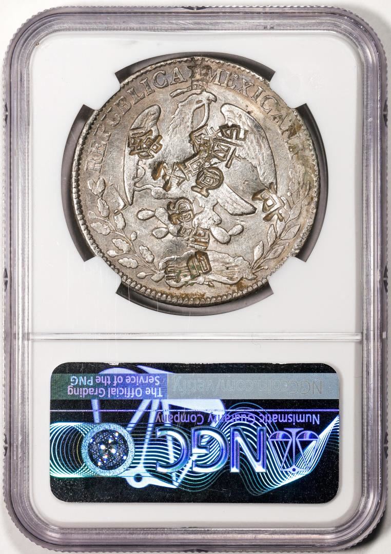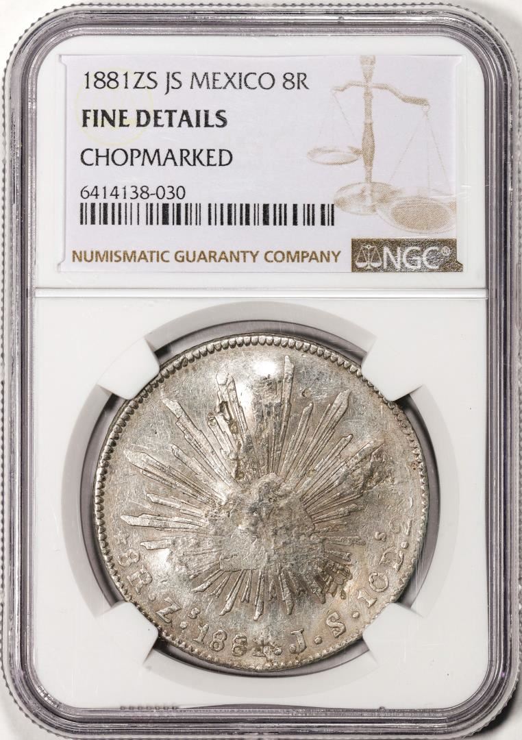 One 1881ZS JS Mexico 8 Reales Silver Coin NGC Fine Details Chopmarked. NGC Certified.