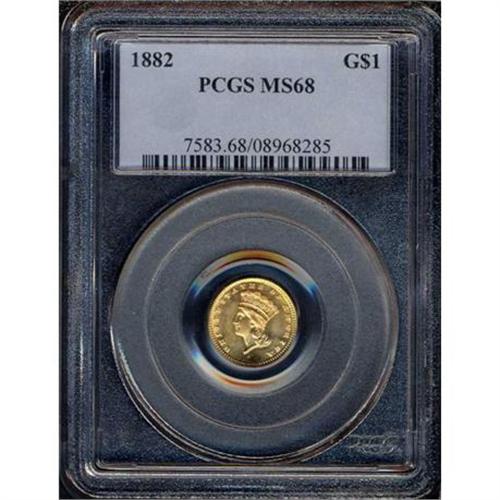 <b>1882 $1 Gold Indian. PCGS graded MS68.</b> PCGS Pop: 33/0. The otherwise orange-gold color yields to warmer golden-rose hues in places, with the luster full, satiny to partly reflective. Given the proper amount of strike pressure, the coin was fully brought up by the dies as well. Among the finest certified by PCGS <b>(PCGS # 7583)</b> <i>