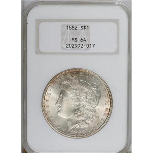 <B>1882 $1 MS64 NGC.</B></I> NGC Census: (4485/1102). PCGS Population (3344/1129). Mintage: 11,101,100. Numismedia Wsl. Price for NGC/PCGS coin in MS64: $57. (#7132)<BR><BR><B>Coin Engraver:</B> George T. Morgan<BR><BR><b>Shipping:</b> Coins & Currency (<a target="_blank" href="http://www.heritageauctions.com/common/shipping.php">view shipping information</a>)
