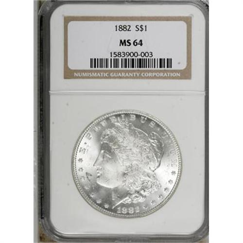 <B>1882 $1 MS64 NGC.</B></I> NGC Census: (4647/1145). PCGS Population (3376/1146). Mintage: 11,101,100. Numismedia Wsl. Price for NGC/PCGS coin in MS64: $57. (#7132)<BR><BR><B>Coin Engraver:</B> George T. Morgan<BR><BR><b>Shipping:</b> Coins & Currency (<a target="_blank" href="http://www.heritageauctions.com/common/shipping.php">view shipping information</a>)