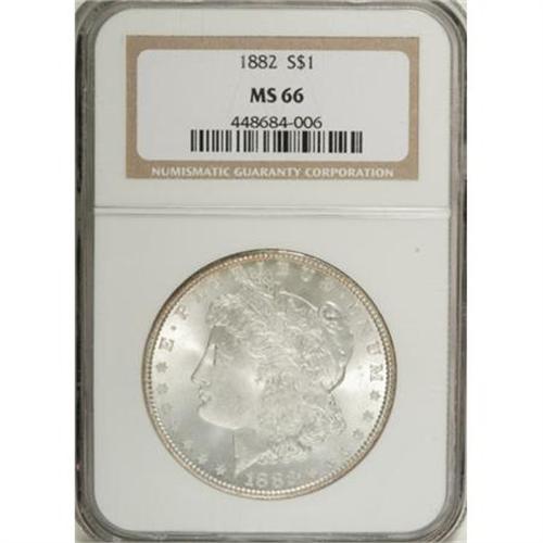 <B>1882 $1 MS66 NGC.</B></I> Sharply struck with shimmering luster and surfaces that are essentially untoned on the obverse, while showing a slight degree of tan color on the reverse. Other than a few tiny nicks and spots, both sides of the piece are remarkably well preserved.<BR><I>From the Reuben Reinstein Collection.</B></I><BR><BR><b>Shipping:</b> Coins & Currency (<a target="_blank" href="http://www.heritageauctions.com/common/shipping.php">view shipping information</a>)