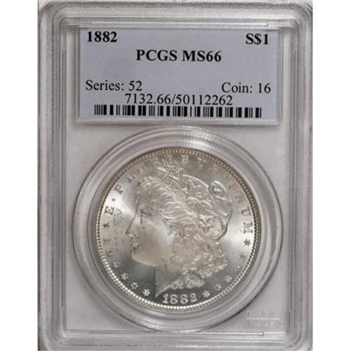 <B>1882 $1 MS66 PCGS.</B></I> Powerful luster and amazing eye appeal go hand in hand for this P-mint Premium Gem. The pillowy devices are beautifully preserved. PCGS has graded six finer examples (1/08).<BR><I>From The Jimmy G. PCGS Registry Collection of Morgan Dollars with Varieties.</B></I><BR><BR><B>Coin Engraver:</B> George T. Morgan<BR><BR><b>Shipping:</b> Coins & Currency (<a target="_blank" href="http://www.heritageauctions.com/common/shipping.php">view shipping information</a>)