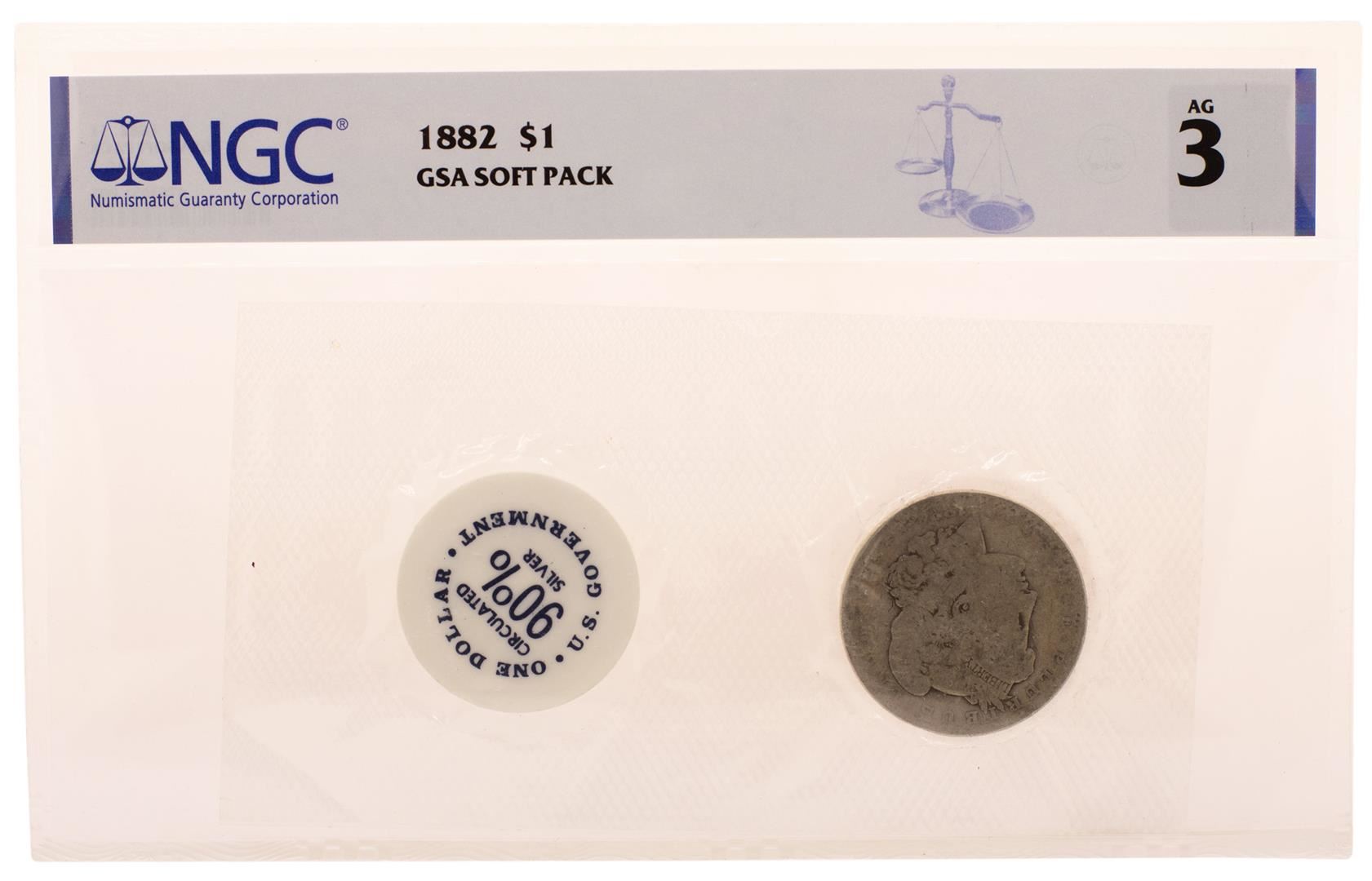 One 1882 $1 Morgan Silver Dollar Coin GSA Soft Pack NGC AG3 Lowest Known Grade.