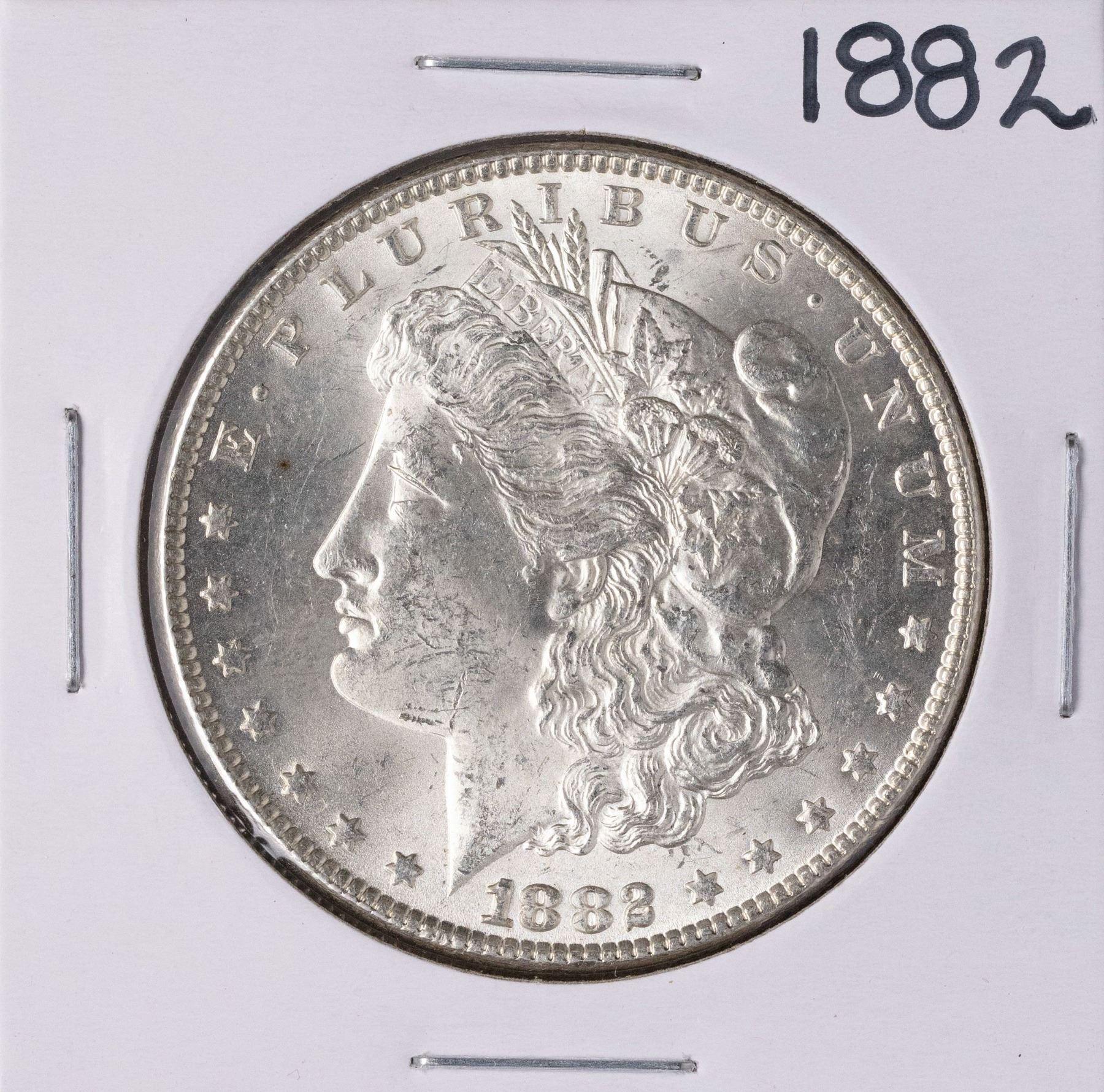 One 1882 $1 Morgan Silver Dollar Coin.