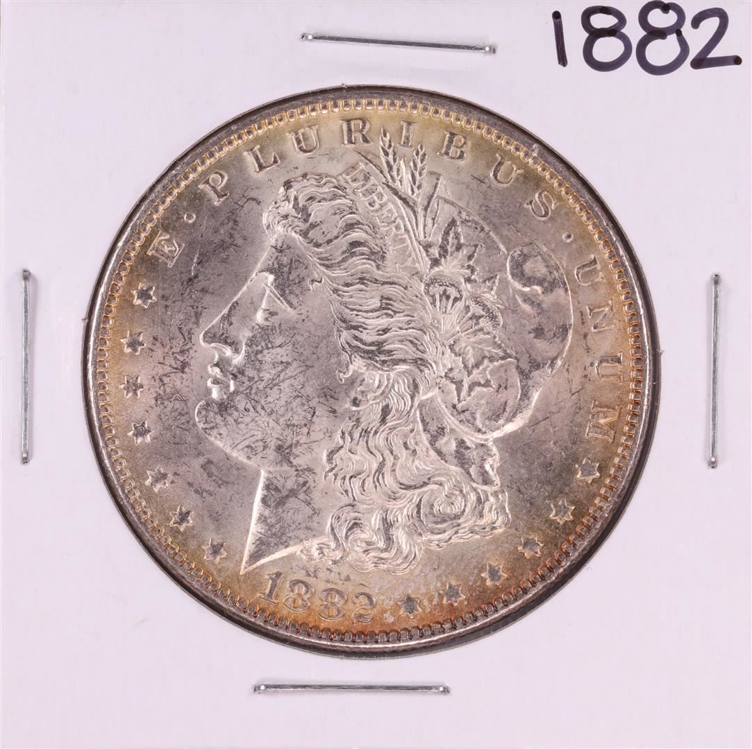 One 1882 $1 Morgan Silver Dollar Coin.