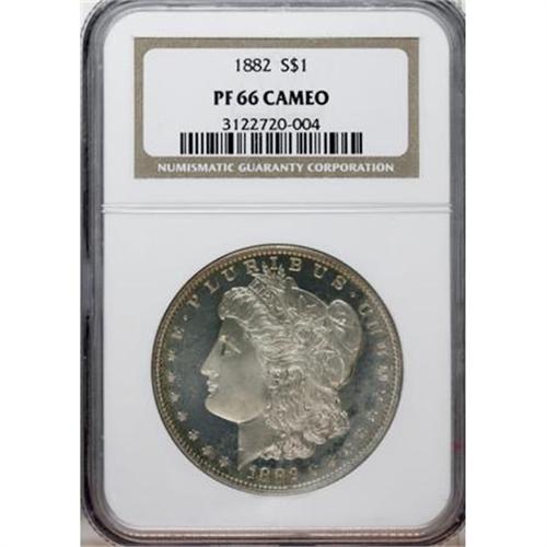 <B>1882 $1 PR66 Cameo NGC.</B></I> An attractive Premium Gem exemplar from this popular early Morgan dollar issue, boldly struck with light champagne and orange patina that shows subtle haziness over parts of the fields. Despite the toning, the coin offers distinct contrast between the moderately frosted devices and the powerful mirrors. Immensely appealing. Census: 13 in 66 Cameo, 12 finer (1/08).<BR><I>From The Southwest Collection.</B></I><BR><BR><b>Shipping:</b> Coins & Currency (<a target="_blank" href="http://www.heritageauctions.com/common/shipping.php">view shipping information</a>)