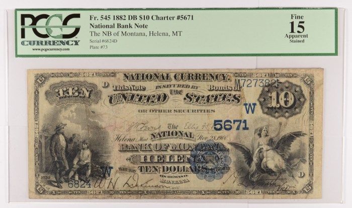 1882 $10.00 NATIONAL NOTE, BANK OF MONTANA, HELENA MT. #5671, PCGS-15